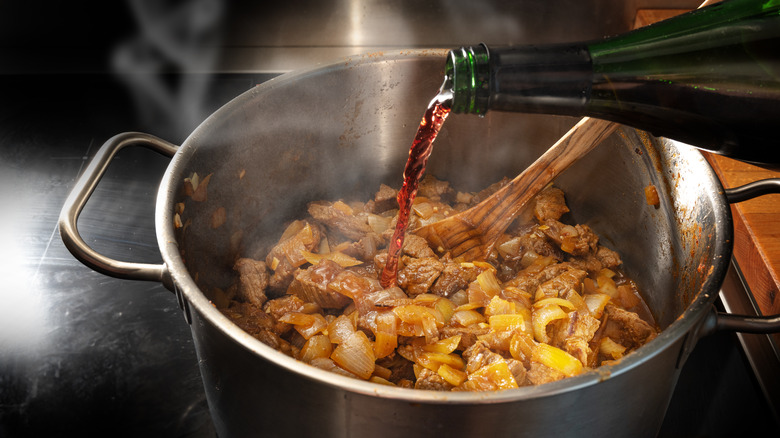 Fine Cooking says that when it comes to long-simmering stews, braises, or sauces, you're going to want to add your wine just after the liquid has started to simmer and you've browned your other ingredients. You'll then let the wine reduce slightly, which helps cook off the alcohol and concentrate all those delicious flavors. After that wine has reduced, Fine Cooking says to add any other liquids you're using, such as stock.
