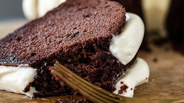 It's not just the impossibly delicious cake that's packed with chocolate flavor; chocolate chips are scattered in for good measure and fleck the base so that there's never a bite without as much fudge as could be desired. This time, the frosting is a lovely juxtaposition; after all that chocolate, a cool cream cheese topping is much appreciated. It means that you can have even more cake because you're chasing it with a contrasting element. And more cake is always the goal, right?