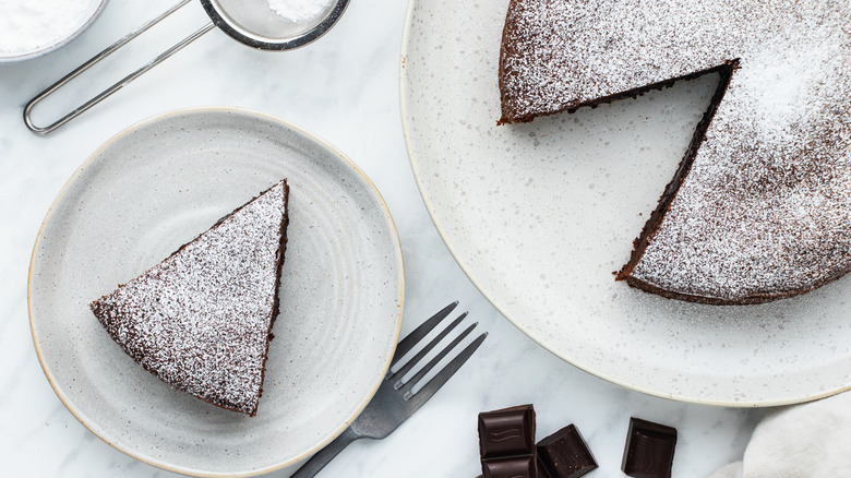 Once cooled, dust the top with powdered sugar for another layer of added sweetness. Then, slice the torte into pieces. This rich torte would be fantastic by itself, but we think it would pair well with an ice-cold glass of milk as well. Brookes also gives a few great serving suggestions. "With ice cream, creme fraiche/mascarpone or chocolate sauce," she suggests.