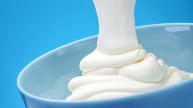 According to Our Everyday Life, the Colorado State University Extension states you can swap in an equal amount of sour cream for mayonnaise. But for mayo to take the place of sour cream in a recipe, you need to combine it with heavy cream and plain yogurt. Specifically, you want an equal amount of all three of these ingredients to be present in order to create a flavor and consistency that's comparable to sour cream. In addition, you'll need to either whisk them together or use a blender to ensure that they're properly combined.