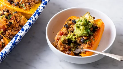 If you're looking for a way to get more quinoa into your diet beyond just serving it as a side dish, these quinoa stuffed bell peppers are for you. They're such a delicious and indulgent way to reap its benefits. These peppers are packed with Latin flavors, like cumin, lime, cilantro, and beans, and serving them with guacamole turns them into a complete meal. This recipe from Alex Shytsman of the plant-based blog The New Baguette is great for weeknight dinners, meal prep, and even for sharing with guests.