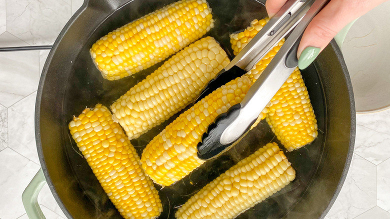 - Add 1 to 2 inches of water to a large skillet and bring it to a simmer. Add the corn and cook for 4 to 5 minutes, turning to cook on all sides. Remove the corn and allow to cool until able to be handled.