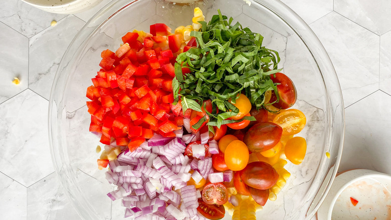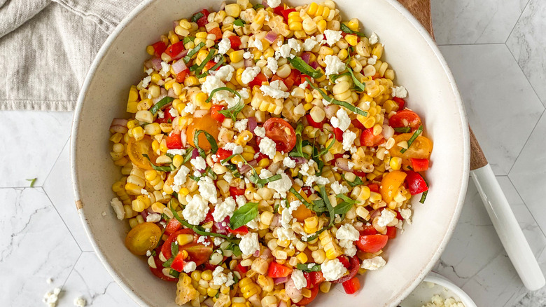- Cut the corn off the cob and add to a large bowl. Add the cherry tomatoes, red onion, bell pepper, and basil and mix. Drizzle with the dressing and toss to coat.