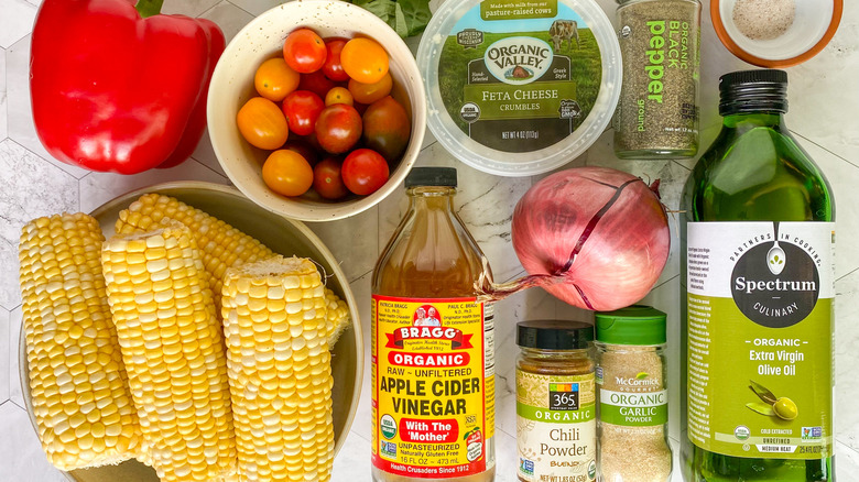 This corn salad requires quite a few fresh ingredients that you will need to pick up from the store. Be sure to grab some apple cider vinegar, olive oil, garlic powder, chili powder, salt, black pepper, six ears of corn, cherry tomatoes, red onion, red bell pepper, fresh basil, and crumbled feta cheese.