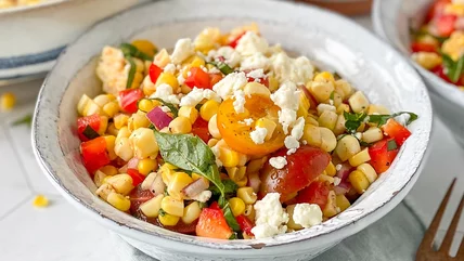 When corn is in season, there's no better way to use it than in a fresh salad. This delicious recipe features corn as the main ingredient, but it also includes a melody of other fresh vegetables like cherry tomatoes and red bell peppers. It's also worth mentioning that the salad comes complete with a light, apple cider vinegar-based dressing with a bit of chili powder to add some extra flavor. Add a little crumbled feta cheese on top, and this is one sublime salad.