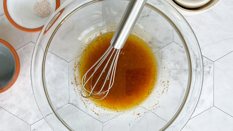 - In a small bowl, whisk together the apple cider vinegar, olive oil, garlic powder, chili powder, salt, and black pepper. Set aside.