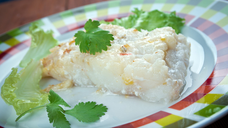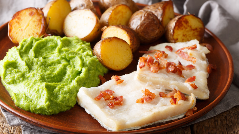 Norway Today offers a plethora of facts about lutefisk, including an apocryphal, but amusing legend that states that a significant number of Norwegian expats left the country to get away from lutefisk, while an equal number traveled forth to share its goodness with the world. Regardless, the traditional Norwegian treatment sees lutefisk either steamed or baked, its mildness complemented by either cream sauce or copious amounts of butter along with bacon, boiled potatoes, and mashed or stewed peas.