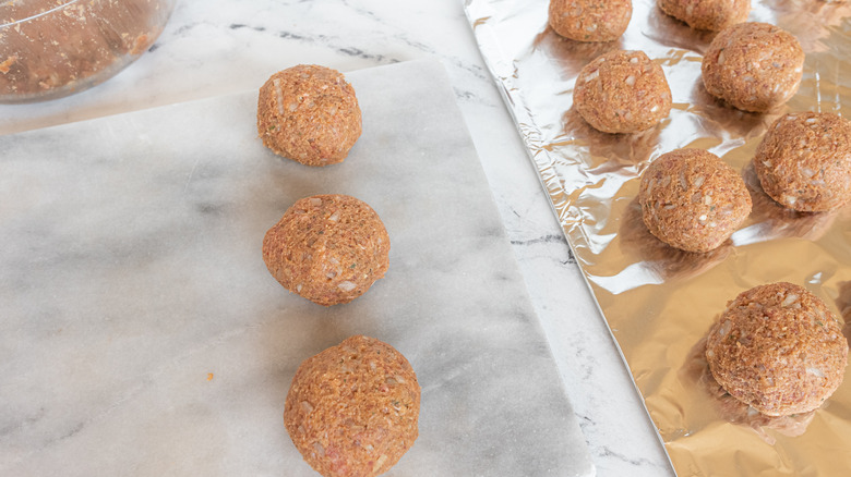 Line a baking sheet with parchment paper or aluminum foil sprayed with cooking spray. "You can also use a baking dish for this step," says Marshall. Using your hands, form the prepared meat mixture into large balls. Place each meatball on the prepared pan. Once the pan is full, place it in the oven to bake the meatballs for 30 minutes.