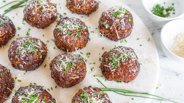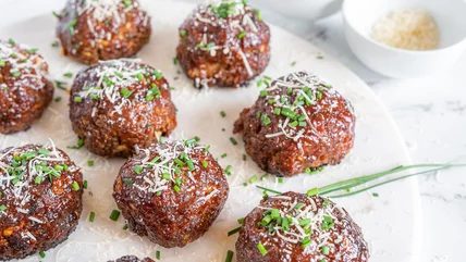 Once the meatballs have baked, remove them from the oven. Use the remaining barbecue to generously brush the meatballs while they're still warm. Sprinkle the meatballs with minced chives and additional shredded Parmesan for garnish, if desired. "I love to serve these with toast for a simple lunch or dinner," says Marshall. Other options? Serve these BBQ meatballs with rice or mashed potatoes for a hearty meal.