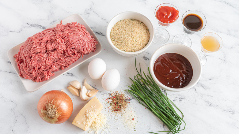 Ready to get started? To dive in on making these BBQ meatballs, grab your ingredients first. For this recipe, you'll need 2 pounds of ground beef, 1 cup of breadcrumbs, two eggs, five cloves of garlic, one yellow onion, shredded Parmesan cheese, barbecue sauce, ketchup, Worcestershire sauce, apple cider vinegar, garlic salt, pepper, and fresh chives for garnish. "I love to use Sweet Baby Ray's barbecue sauce for this recipe because of the tangy flavor it has," says Marshall. "But feel free to utilize any favorite of your own."