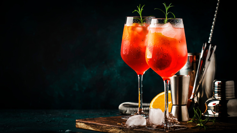 The Campari Spritz is a twin of the Aperol Spritz. Aperol is another bitter Italian aperitivo actually sold by the same company. The main difference between a Campari Spritz and an Aperol Spritz is alcohol content. Campari is 48 proof, while Aperol is only 22, according to A Couple Cooks. The flavor profiles of each are similar in their herbal notes, but a Campari Spritz cocktail yields a more punchy, stronger kick. If you love the easy drinking of an Aperol Spritz, a Campari Spritz is a new way to enjoy the cocktail style, you just may not be able to have as many as usual.