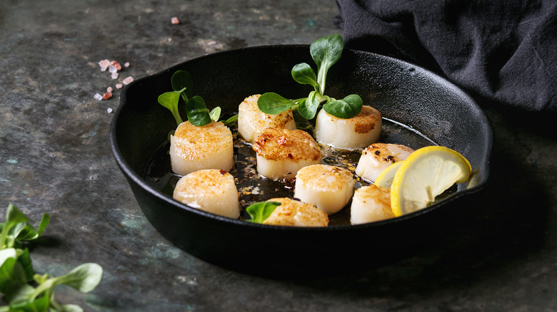 That simple step, which adds just 10 minutes to your prep time, is to brine your scallops first. Brining helps to even out the flavor of wet scallops while removing the chemical taste from the STP, explains A Couple Cooks, who recommends mixing 4 cups of room temperature water with 2 tablespoons of kosher salt and letting the scallops sit in the mixture for 10 minutes. Brining also leads to a more flavorful dish as it also seasons the inside of the scallop. For even more of a flavor impact, you can also add a bit of lemon juice to the brine. Just be sure to pat the scallops dry after removing them from the brine.