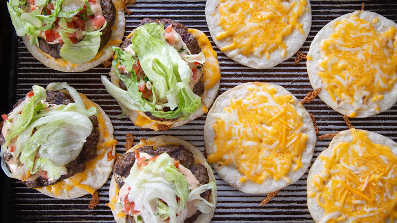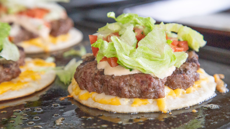 - Place the tortillas, cheese side down, on top of the shredded lettuce-topped burgers. Serve immediately.