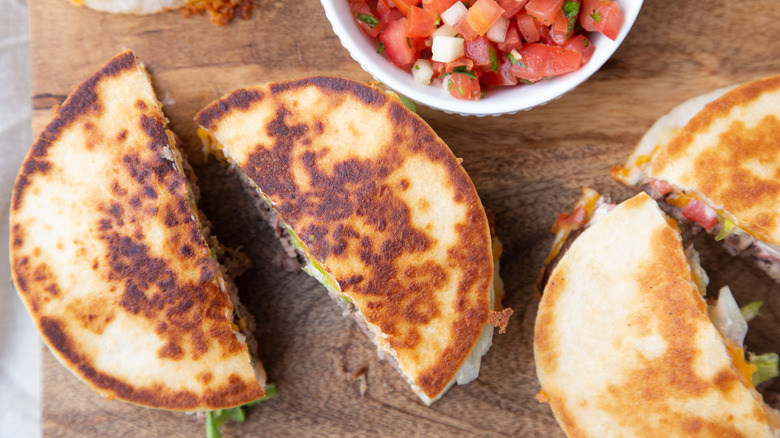 What do you get when you combine one of the most famous American dishes with one of the most popular Mexican ones? Pure magic. The quesadilla burger is an innovative main course that features a ground beef burger patty, a zingy chipotle mayo, and two tortillas covered in cheese that serve as the buns. There are so many great things about this recipe, but we love that it's a unique take on quesadillas and burgers.