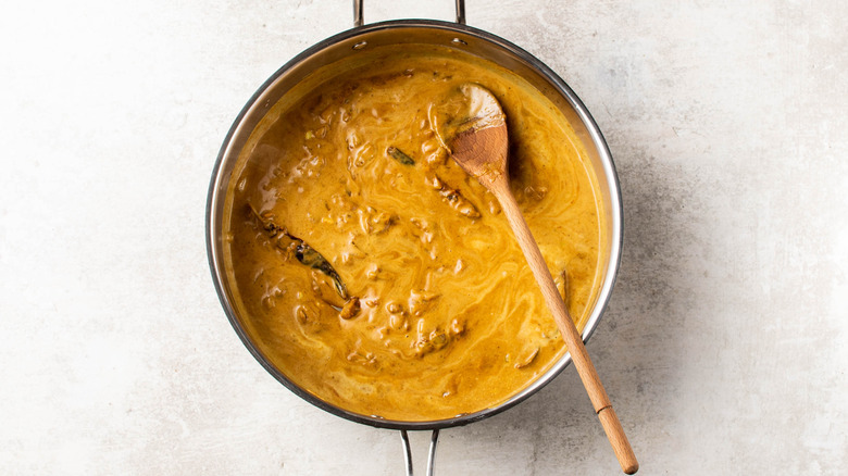 - Stir in the coconut milk until fully combined. Mixture will be thick and a light orange hue. To thin to the broth, add ½ cup of water. Bring to a simmer.
