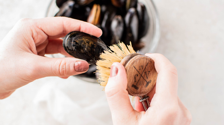- Clean the mussels thoroughly by brushing with a firm scrubber brush. Rinse with cold water and clean off any dirt, sand, or debris. De-beard the mussels as necessary by lightly pulling the "beard" or clump of fibers towards the hinge until it snaps away.