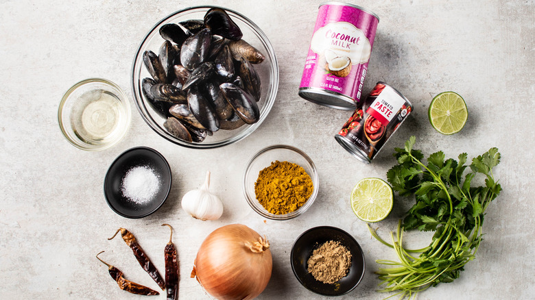 Gather the ingredients for coconut curry mussels