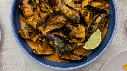 Whether you are looking for something to make for a special occasion or just for a family dinner, these coconut curry mussels are a great option. The flavor of mussels isn't for everyone, but when you love them, you love them. Most people think they need to go to a fancy restaurant to order mussels, but that simply is not the case. Recipe developer Michelle McGlinn came up with this tasty coconut curry mussels recipe that can be made in the comfort of your own kitchen. "I love, love, love mussels! I love the brothy sauce left behind that you can dip bread or fries in," she raves. "It always makes for such a light, shareable meal that's still filling and delicious."
