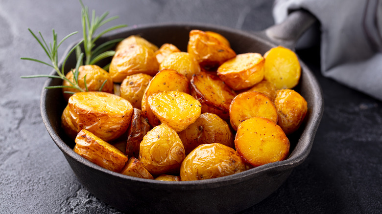 Of course there are other things that will need to be done to get the roasted potatoes just so. In her recipe shared with Barefoot Contessa, actress Emily Blunt recommends roughing up the potatoes in a covered pot by shaking it when its done to create a layer of mash, and its a technique Lopez-Alt can also get behind, per Serious Eats. Once that's done, make sure the fat you use to crisp up your potato, whether its vegetable oil as Blunt recommends, or beef/goose fat as Lopez-Alt suggests, is smoking hot, which should result in potatoes you aren't likely to forget.