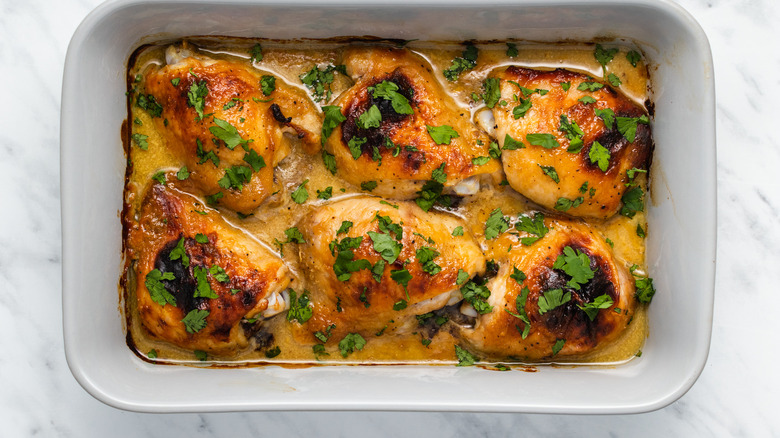 Now that you've added the sauce, pop the chicken thighs into the oven. Set your timer for 40 minutes to cook the chicken to perfection. "If you want to check the internal temp, they should be 170 F when done," Brookes shares.