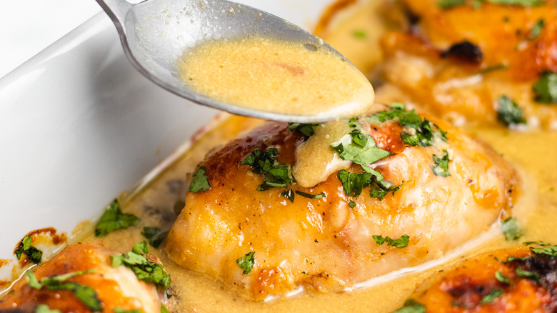 - Spoon the honey mustard sauce over the chicken.