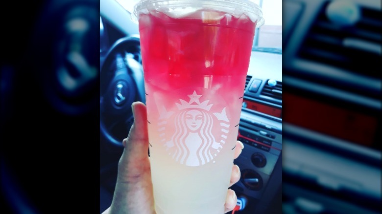 Many drinks on the Starbucks secret menu go viral not necessarily for their taste but for how they look. This drink called the firecracker is one of those. It is made with a few different drink mix-ins, and the finished product is a vibrant, colorful drink with a satisfying red to yellow ombré effect. It's both Instagram-able and tastes fruity and refreshing.