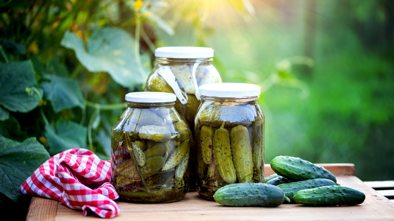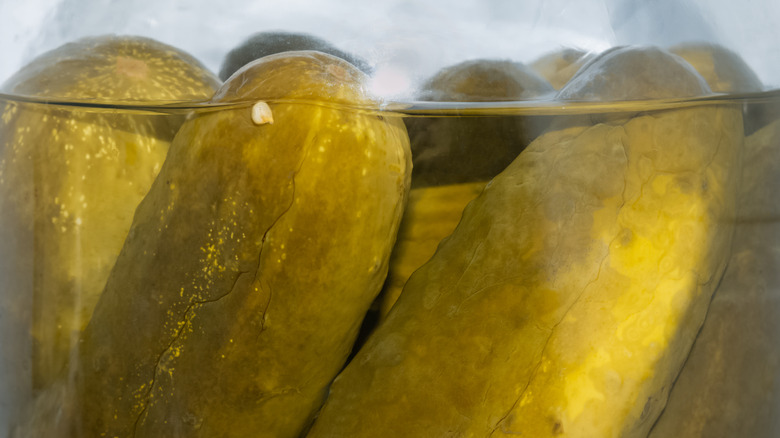 There are also several visual and olfactory signs of spoiled pickles that you certainly won't want to bite into. If the pickles have a strange odor, meaning they smell different than the dill and vinegar a fresh jar would emit, the pickles have likely gone bad. Look for discoloration or cloudy brine as well. If you see either, then it's time to toss the jar. The last way to check for bad pickles is to look for signs of mold, which will likely be green, gray, or white, and can sometimes look fuzzy.