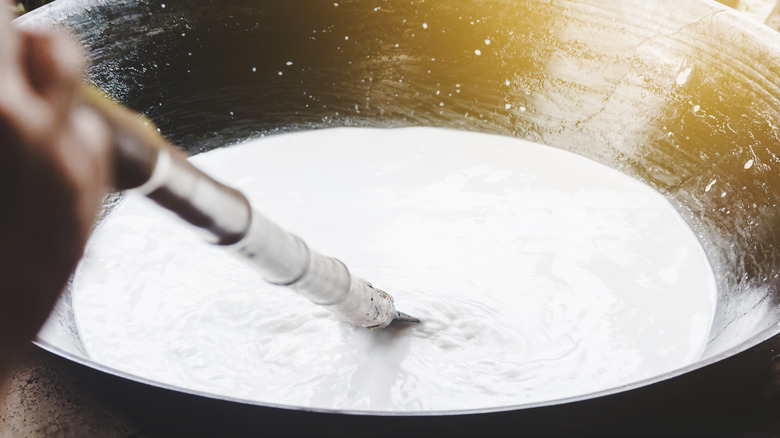 So, what exactly is coconut milk? Not to be mistaken with coconut water (the liquid that occurs naturally inside the coconut), coconut milk is created from the meat of a mature coconut (via Eater). To extract the milk, a coconut is cracked opened, scraped, and shredded. The meat is then added to hot water to soften before it's finally squeezed to produce coconut milk.