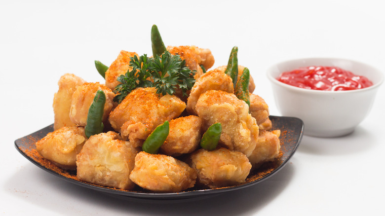 Having said that, there is a way to enjoy tofu that even Redditors who are on the fence about the ingredient can get behind, and that is to either press it or to flash freeze it, then fry it with or without a breaded crust until it turns into a crispy, golden delight. This will ultimately take your tofu to the next level. From there, crispy tofu can be served simply with salt and pepper or with a glaze to make tofu fries, a vegan version of General Tso's chicken, or kebabs. But if you want to enjoy your crispy tofu without adding unnecessary calories or sodium to the dish, there is one other ingredient you can throw in.