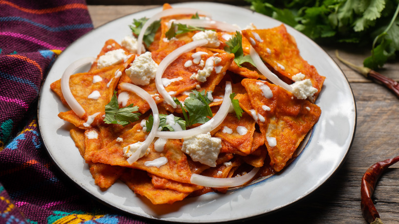 Have you ever chowed down on a plate of chilaquiles? This brunch staple and hangover helper consists of tortilla chips or fried strips of tortillas that are simmered in either red or green salsa, becoming soft as their starch thickens the salsa at the same time (via Kitchn). After being plated, chilaquiles are topped with a variety of add-ons, including crumbled queso fresco, tangy crema, sliced avocado, and fried eggs. As their name indicates, chilaquiles are a Mexican dish, with the word "chilaquiles" being traced back to the indigenous Mexican language Nahuatl and meaning "chiles and greens" (via Kitchn).