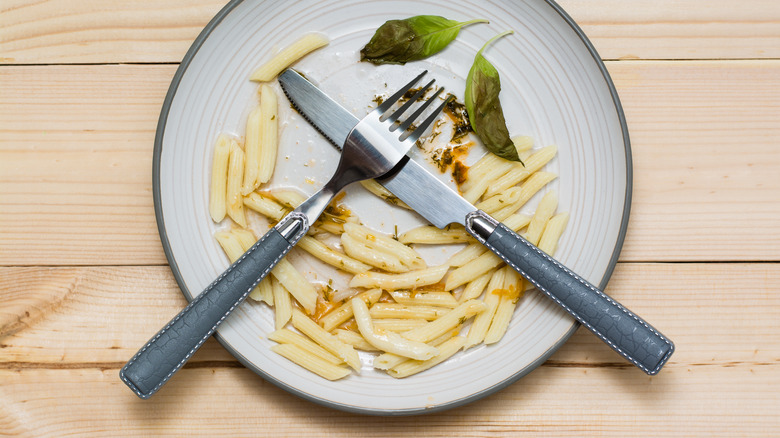 To make this science work for you and your leftovers, try this simple step. After boiling your pasta, drain or rinse it like normal, then transfer the cooked pasta to a bowl of olive oil and toss, via Smithsonian Magazine. This will prevent your sauce from sticking to the pasta and absorbing. Just be sure not to add any oil to the water. How much olive oil you'll need depends on how much pasta you're cooking, but in general, the pasta should be thoroughly coated without swimming.
