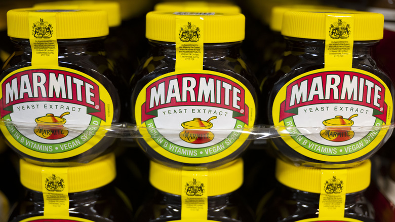 To the untrained eye (or palate), Marmite and Vegemite might seem interchangeable. After all, they're both dark spreads made from brewer's yeast extract that lends a savory umami flavor, meaning both work well as a soy sauce substitute. You can find both in their signature yellow-lidded glass jars with labels of red and yellow. And for anyone who hasn't grown up eating it, both are extremely salty and pungent — to the point of being polarizing.