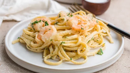 There's nothing quite like a warm, creamy pasta dish paired with a glass of wine to make dinner time feel like a special occasion. This shrimp linguine Alfredo recipe courtesy of Jaime Shelbert, dietitian and recipe developer of Wholly Nourished, is the perfect option to level up your weeknight meals. And given that it only takes 30 minutes to prepare and cook the recipe, it really is possible to make it on a weeknight without stressing about whether you have the time or energy. In fact, that's Shelbert's favorite part about the dish. "I love how quickly and easily this comes together, yet it's impressive enough to serve for guests," she says.