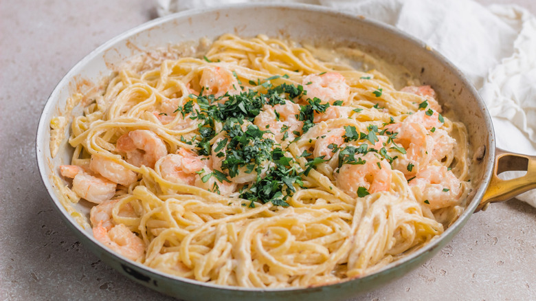 As the recipe name implies, you're going to need shrimp (Shelbert suggests the frozen, precooked style, pre-thawed and with the tails removed) and linguine pasta on hand, but you'll also need ingredients to make your own Alfredo sauce. If making homemade Alfredo sounds intimidating, don't let it make you nervous, it's surprisingly easy to make. You'll need butter, garlic, chicken broth, heavy cream, shredded Parmesan, and salt and pepper to whip up a batch. Finally, you'll need fresh chopped parsley to add to the final product, rounding out the dish. And of course, if you have a personal preference for fresh, raw shrimp, don't hesitate to sub it in. "I just prefer the frozen precooked which are already shelled, [and] easy to thaw and toss in a sauté pan," Shelbert explains.