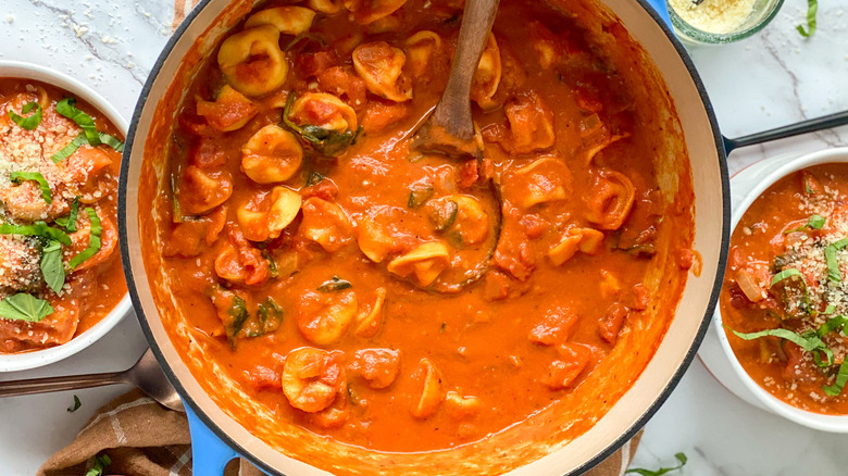 Tomato soup is acclaimed as a childhood classic, but the truth is, it's often very plain and bland, especially the store-bought kind. When you make it yourself, though, you can add a lot of flavor as well as embellishments like pasta, and such is the case with this creamy tomato tortellini soup.