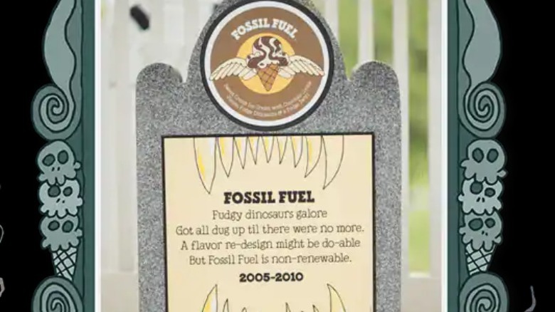 The fallen Fossil Fuel flavor consists of sweet cream ice cream, chocolate cookie pieces, fudge dinosaurs, and a fudge swirl. While the flavor undoubtedly tastes delicious, the Fossil Fuel ice cream is not the only thing Ben & Jerry's wants to bury. In addition to this ice cream flavor making its way to the graveyard, Ben & Jerry's decided to figuratively bury fossil fuel pollution as well (via Ben & Jerry's).