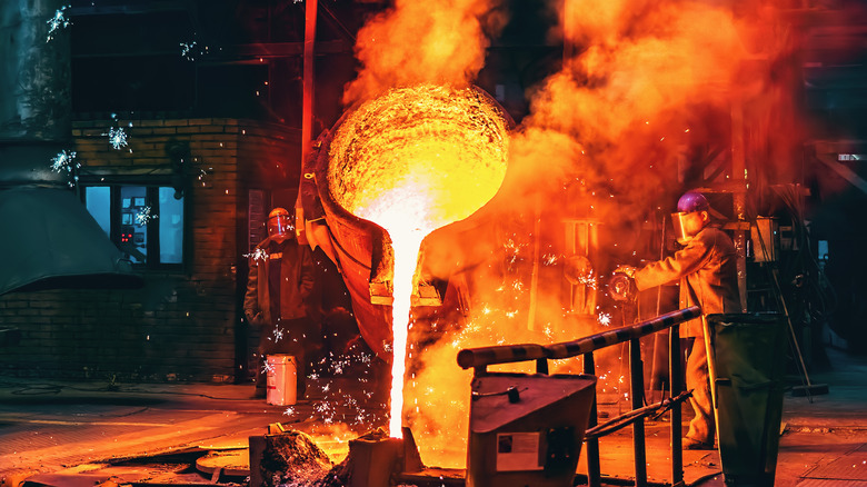 What exactly is cast iron? According to Engineering Choice, it is an iron-carbon alloy containing at least 2-4% carbon, along with elements that can include silicon, manganese, sulfur, and phosphorus. Upon smelting from ore, iron is poured into ingot molds. Those ingots are then re-fired, usually with scrap metal, and, from there, molded into the final form of the end product, such as skillet. Cast iron is also used to make parts for the automobile industry, and in construction, such as The Iron Bridge of England, completed in 1779, per Shropshire Star.