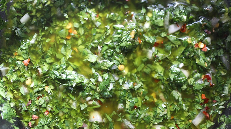 Chimichurri is quite the trendy condiment at present, but what is it and where does it come from? Eat Flavorly explains that this herb-based sauce is native to both Argentina and Uruguay, and while there are numerous variations on the recipe, all chimichurris tend to have a few ingredients in common: garlic, parsley, chiles, olive oil, and vinegar. The other ingredients added determine whether the chimichurri is a red or a green one.