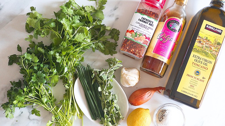 Ryu's chimichurri begins with a base of red wine vinegar and lemon juice. She then adds a chopped shallot and some garlic as well as a whole lot of greenery: parsley, cilantro, fresh oregano, and chives. The sauce also includes olive oil, and you'll need some crushed red pepper, salt, and black pepper for seasoning.