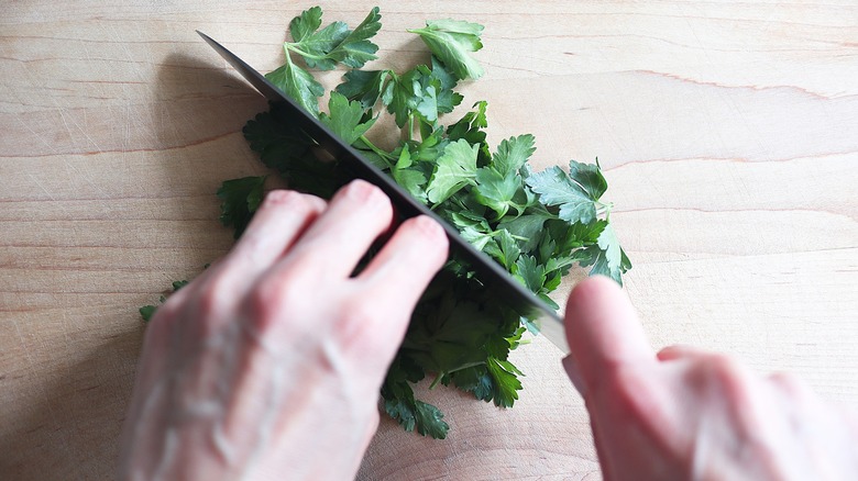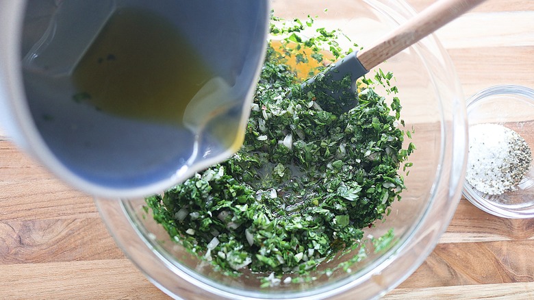 After you've mixed up the chimichurri, don't use it right away. Instead, Ryu advises letting it sit for at least 20 minutes, telling us that this rest period will "release the flavors of the herbs." If you're not planning to use the sauce right away, you may store it in the fridge, but it will taste better if you take the time to bring it back to room temperature before serving. Ryu says, "I always serve chimichurri with skirt steak or roasted chicken," but adds that it can be served as a sauce for other types of meats and sausages and also as a topping for roast potatoes. You can also use chimichurri as a marinade for meat before you cook it.