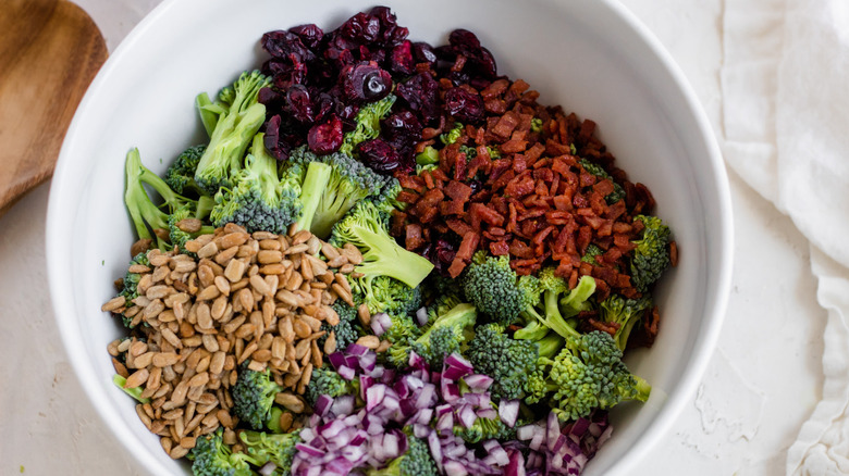 - Add the onion, sunflower seeds, cranberries, and bacon to the broccoli and mix to combine.