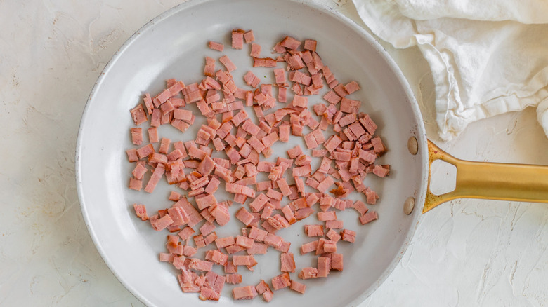 - Heat a skillet over medium heat and add the chopped bacon. Cook until crispy, then remove from heat and set aside.