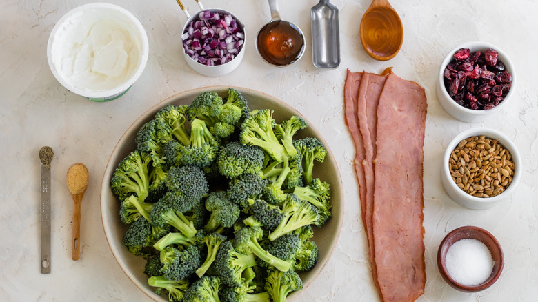 As shown here, this recipe calls for turkey bacon, chopped small, Greek yogurt (2% or full fat), rice vinegar, water, honey, salt, pepper, garlic powder, about 5 cups of broccoli florets (which is about 1 pound of broccoli or two medium heads), diced red onion, sunflower seeds, and dried cranberries (or raisins).