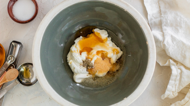 - Meanwhile, make the dressing by adding the yogurt, vinegar, water, honey, salt, pepper, and garlic powder to a small bowl, then whisking until they are combined.