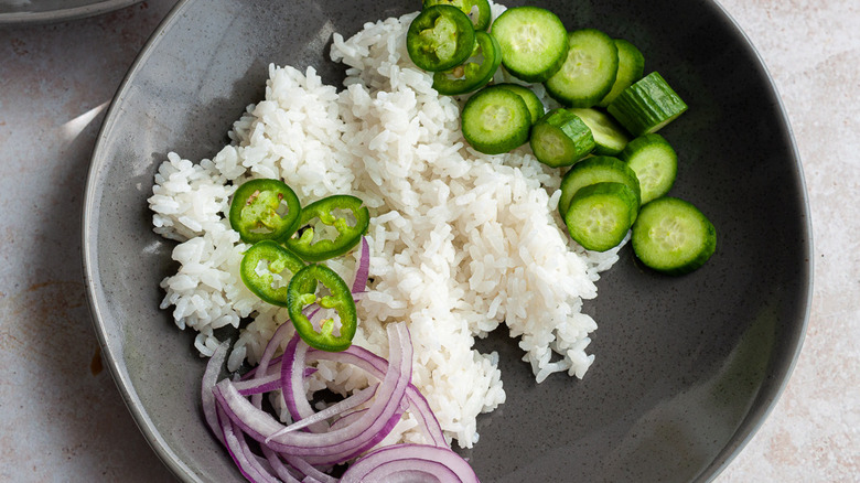- Meanwhile, begin to assemble the bowls by adding ½ cup rice to each bowl. Top with sliced jalapeño, red onion, and cucumber.