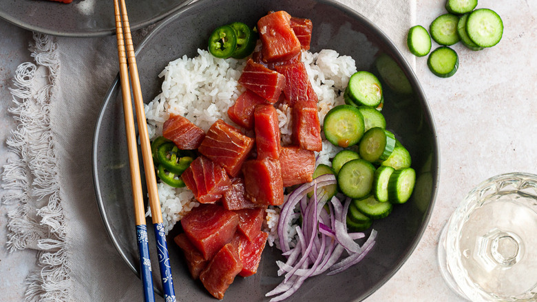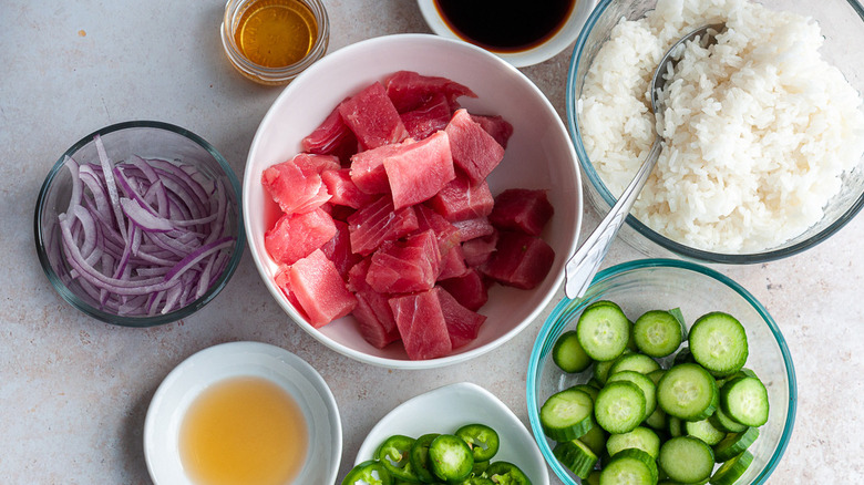 If the thought of sourcing affordable, sushi-grade tuna has you in a tizzy, fear not! "Aldi sells frozen sushi-grade ahi tuna for an amazing price," Musgrave says. You'll just have to let the fish thaw and cut it into cubes. In addition to the tuna, you'll also need soy sauce, sesame oil, rice vinegar, cooked sushi rice, and some sliced veggies: jalapeño, red onion, and cucumber.