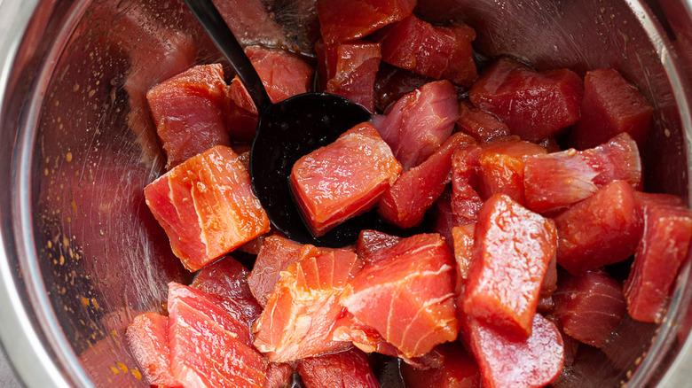 The tuna is the star of this Hawaiian dish, so you'll want to load it with as much flavor as possible. To do so, add the soy sauce, sesame oil, and rice vinegar into a bowl along with the tuna cubes. Toss everything so that each piece of fish is evenly coated, then put the whole bowl in the fridge for 15 minutes. This is the most time-consuming part of the recipe, but in those 15 minutes, the tuna will have a chance to absorb all the flavors of the marinade.