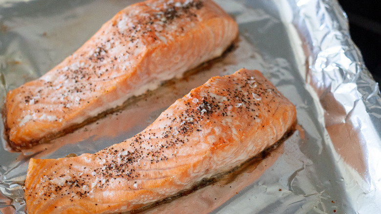 Many great recipes start out the exact same way: preheating your oven. Set yours to 425 F, then line a baking sheet with aluminum foil. Drizzle 1 teaspoon of olive oil onto the foil, then place both fillets on there, skin-side down. Season the salmon with a teaspoon each of salt and pepper. Once the oven is preheated, pop in the baking sheet and allow the fillets to cook for 12 minutes.