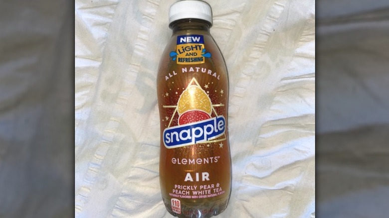 After tasting all three flavors of Snapple's new Elements line, we have a clear and easy winner. We think that Snapple's claim that their Elements drinks are "impossibly light and refreshing" is a bit of a reach, but the air flavor fits the bill most closely. The Elements air flavor is labeled prickly pear & peach white tea, and that's exactly what it tastes like. While most of Snapple's tea products are made with black and/or green tea leaves, this is the only flavor thus far that is made with white tea. According to Simple Loose Leaf Tea Company, white tea has many similarities to both green and black tea, like the fact that they all contain a hearty amount of antioxidants and caffeine. As such, Elements air is the only one of the three Elements flavors that contains caffeine — approximately 18 mg per 15.9-ounce bottle, according to Snapple.