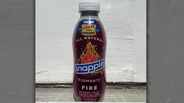 In March of 2022, Snapple relaunched its Snapple Elements line. After tasting all three flavors, we concluded that the Elements fire, which is dragonfruit flavored, ranked as second-best. The Snapple Elements line is supposed to be associated with, obviously, the Earth's natural elements, and as such, the drinks don't contain anything artificial. With 20 grams of added sugars per 15.9-ounce bottle, the drink can't necessarily be considered healthy, but it does contain less sugar than similar Snapple beverages, like the fruit punch juice drink, which packs in more than 40 grams of added sugars per bottle (via Snapple).